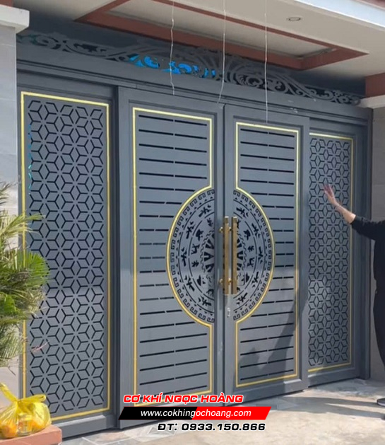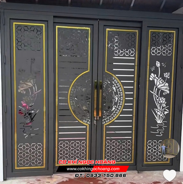 Cửa sắt trượt quay CNC: Cửa làm từ sắt tấm dày sau đó sử dụng công nghệ cắt sắt laser tạo ra những họa tiết cầu kỳ, tinh tế, sắc nét đến từng chi tiết.